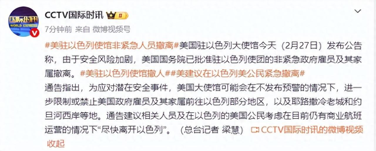 美国务院下令非紧急必要外交官撤离以色列,美国驻以色列大使馆:建议在以美国公民“尽快离开以色列”